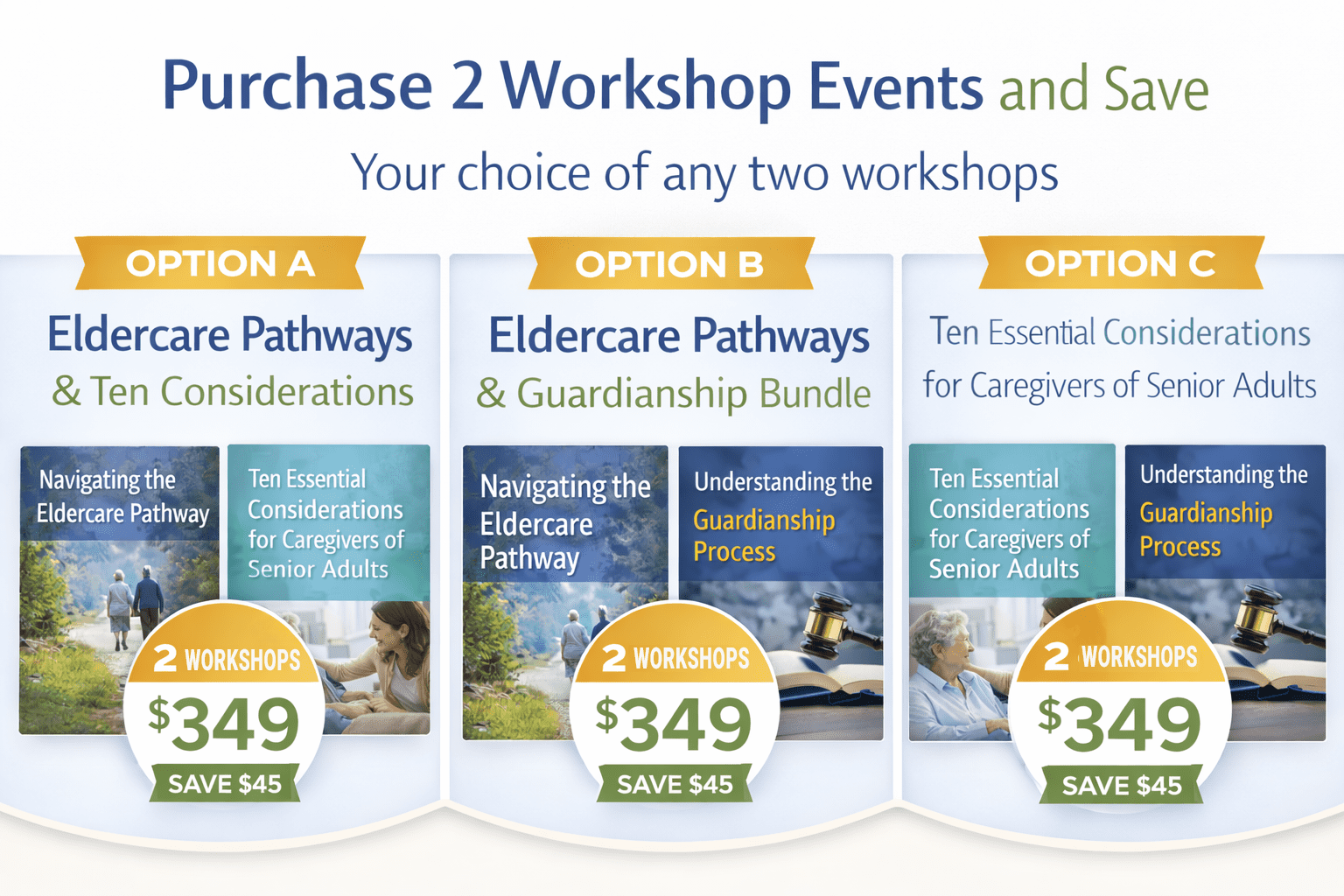 | Workshop Bundle | A) Eldercare Pathways + Ten Essentials, B) Eldercare Pathways + Guardianship, C) Ten Essentials + Guardianship |